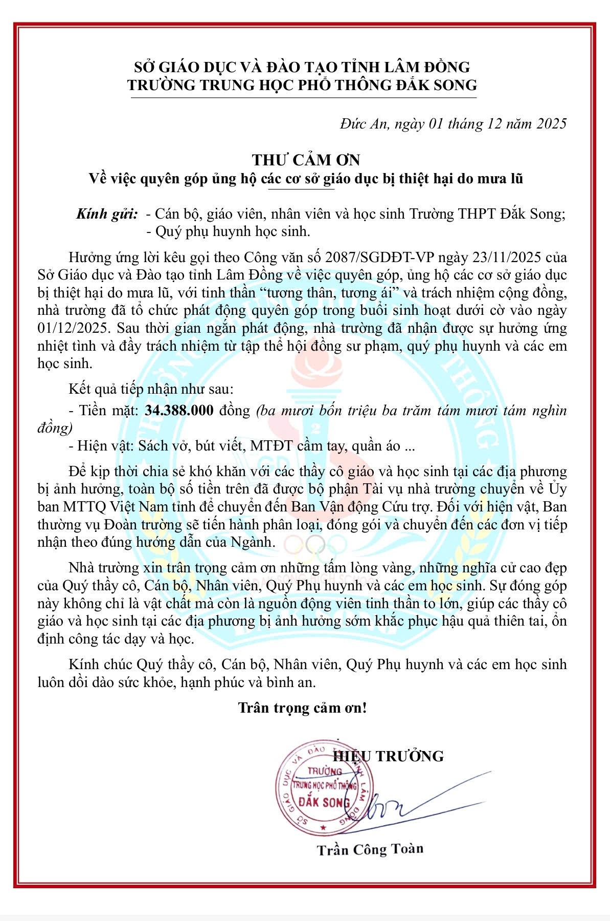 Thư cảm ơn của Hiệu trưởng về việc quyên góp ủng hộ các Cơ sở giáo dục bị thiệt hại do bão lũ