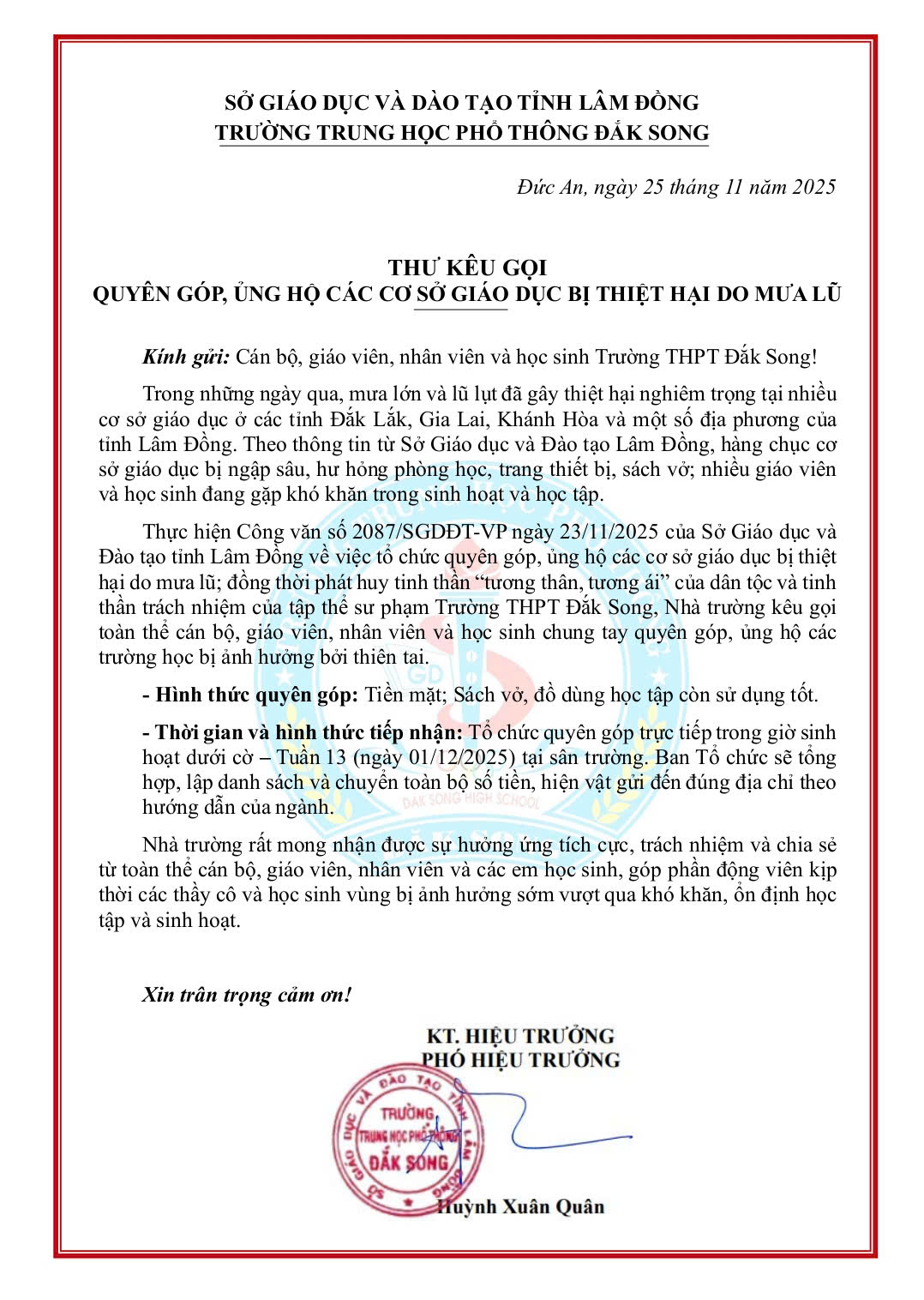 THƯ KÊU GỌI QUYÊN GÓP, ỦNG HỘ CÁC CƠ SỞ GIÁO DỤC BỊ THIỆT HẠI DO MƯA LŨ