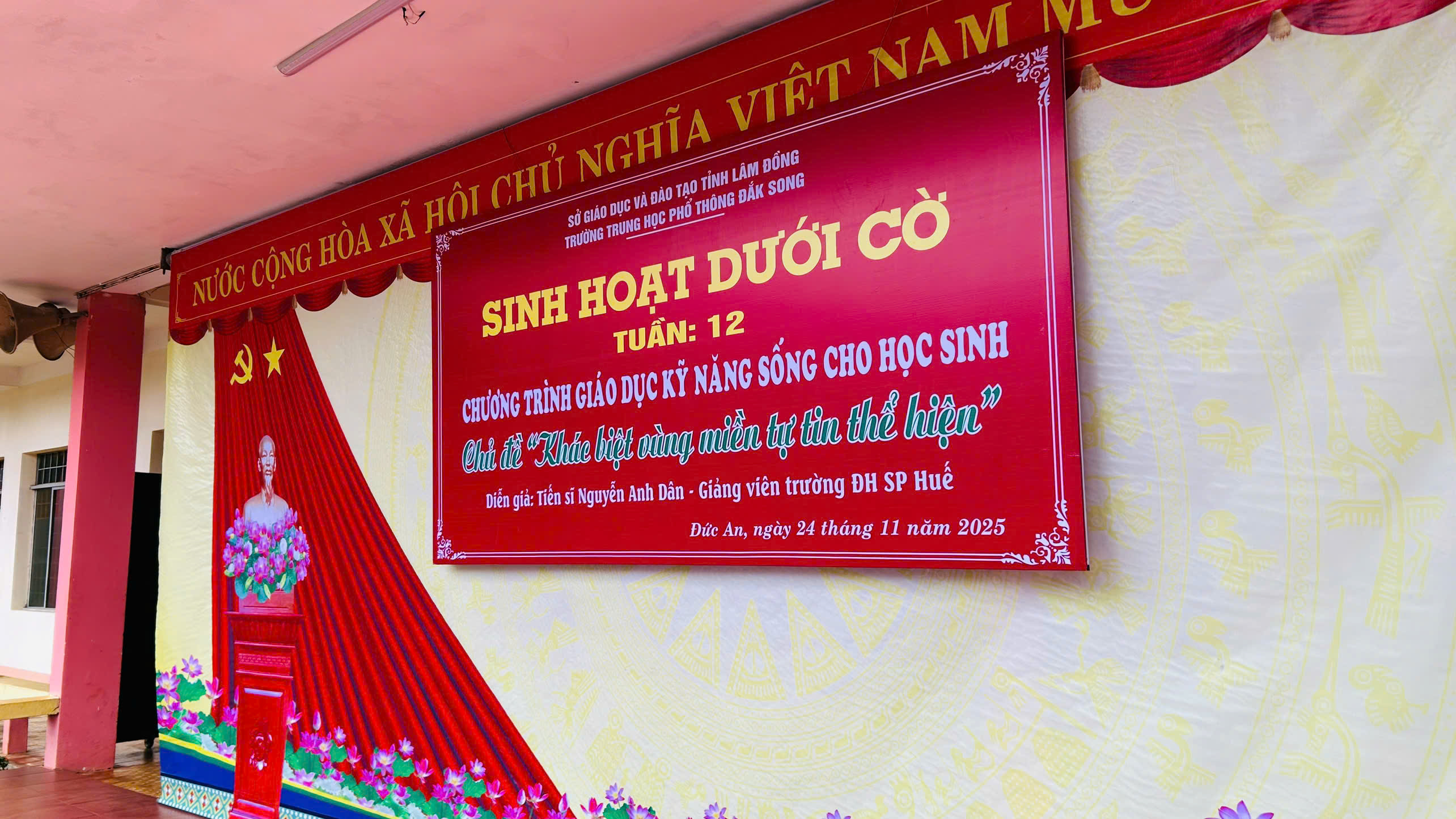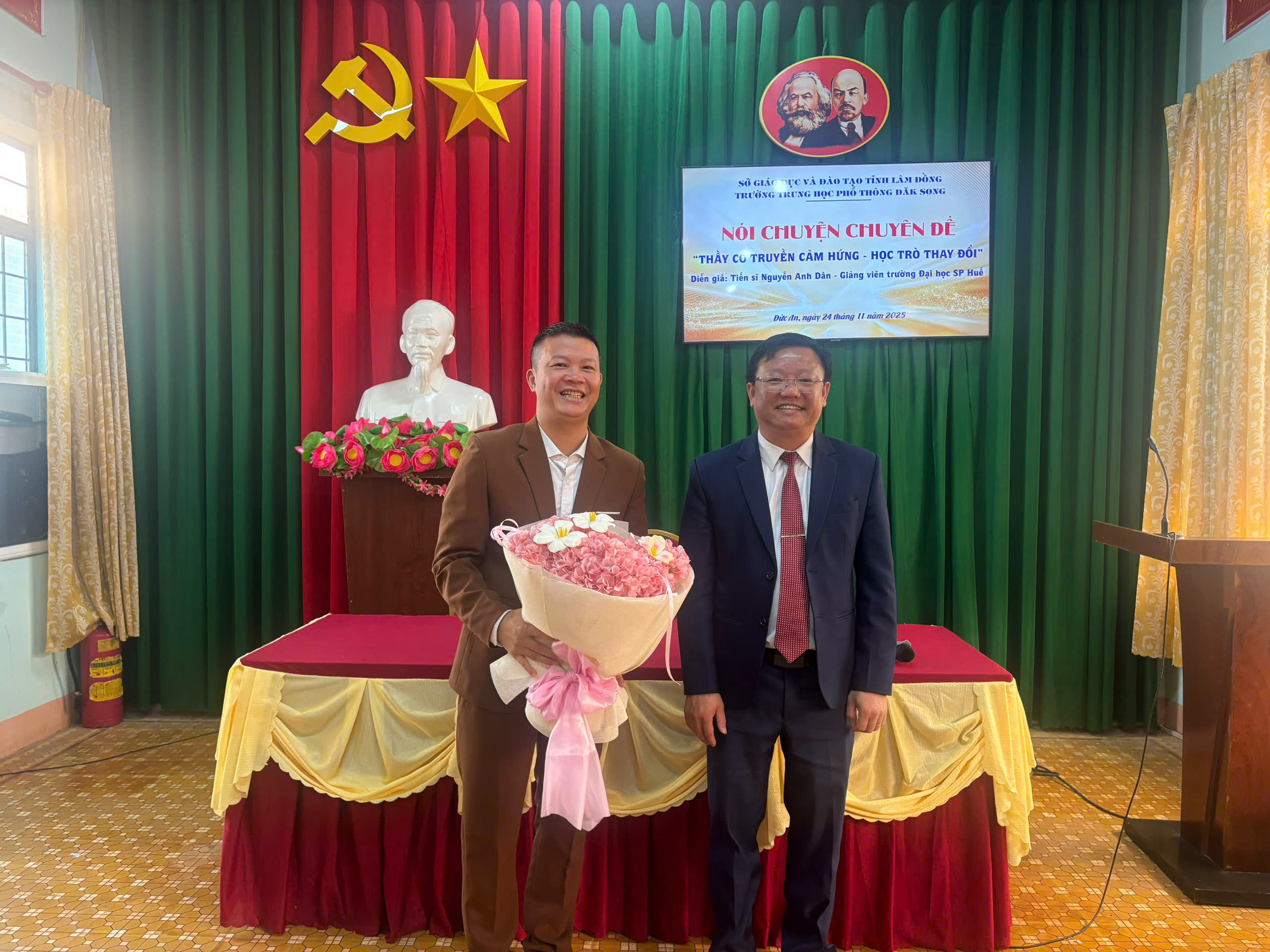 Ngày 24/11/2025, Trường THPT Đắk Song tổ chức chương trình giao lưu, chia sẻ kỹ năng với Tiến sĩ Nguyễn Anh Dân – Giảng viên Trường Đại học Sư phạm Huế, chuyên gia giáo dục, người sáng lập Cảo Thơm Foundation. Chương trình do nhà trường phối hợp thực hiện, trên cơ sở đề xuất ý tưởng từ nhóm học sinh tham gia dự án nghiên cứu khoa học kỹ thuật cấp trường.