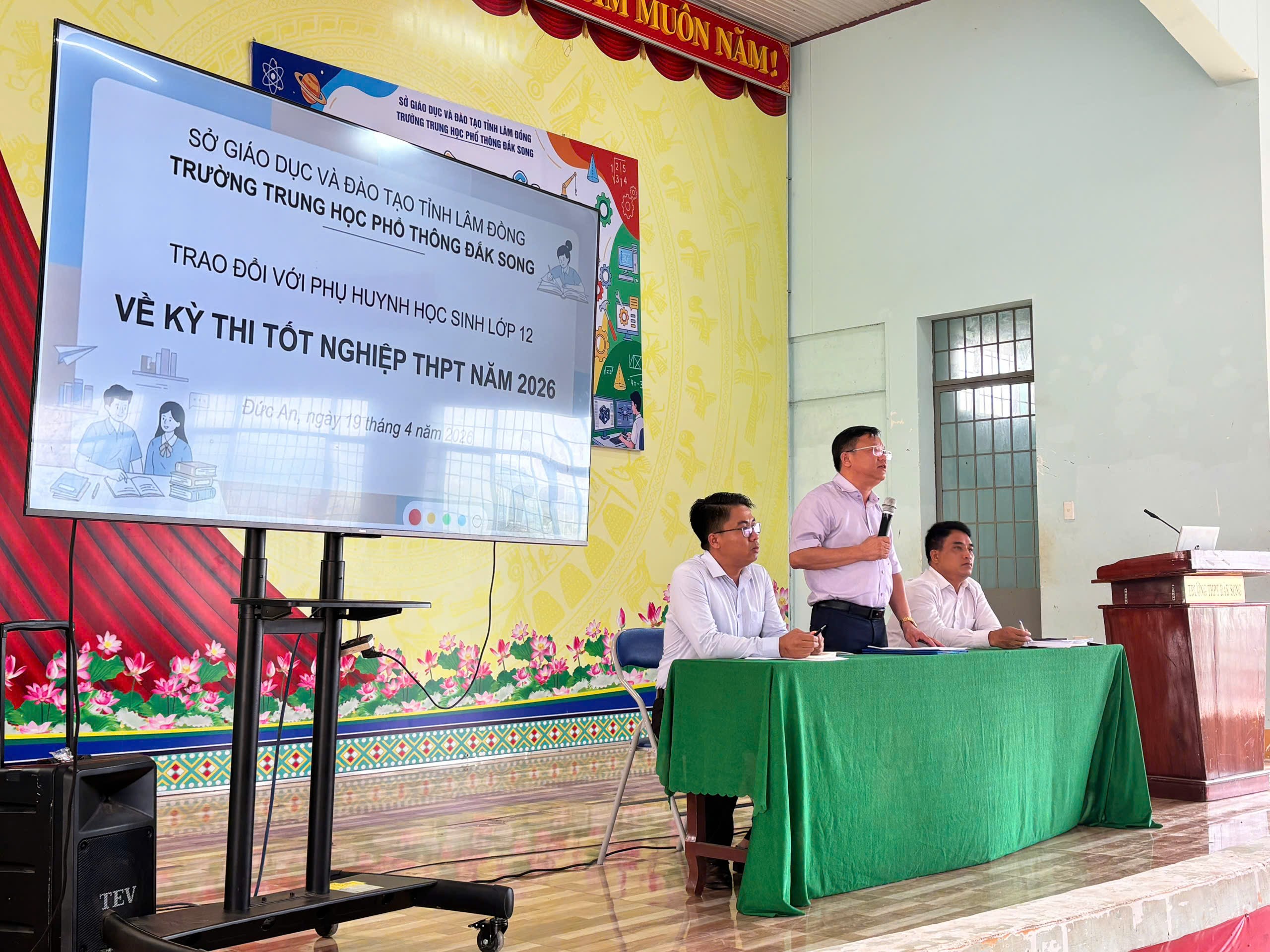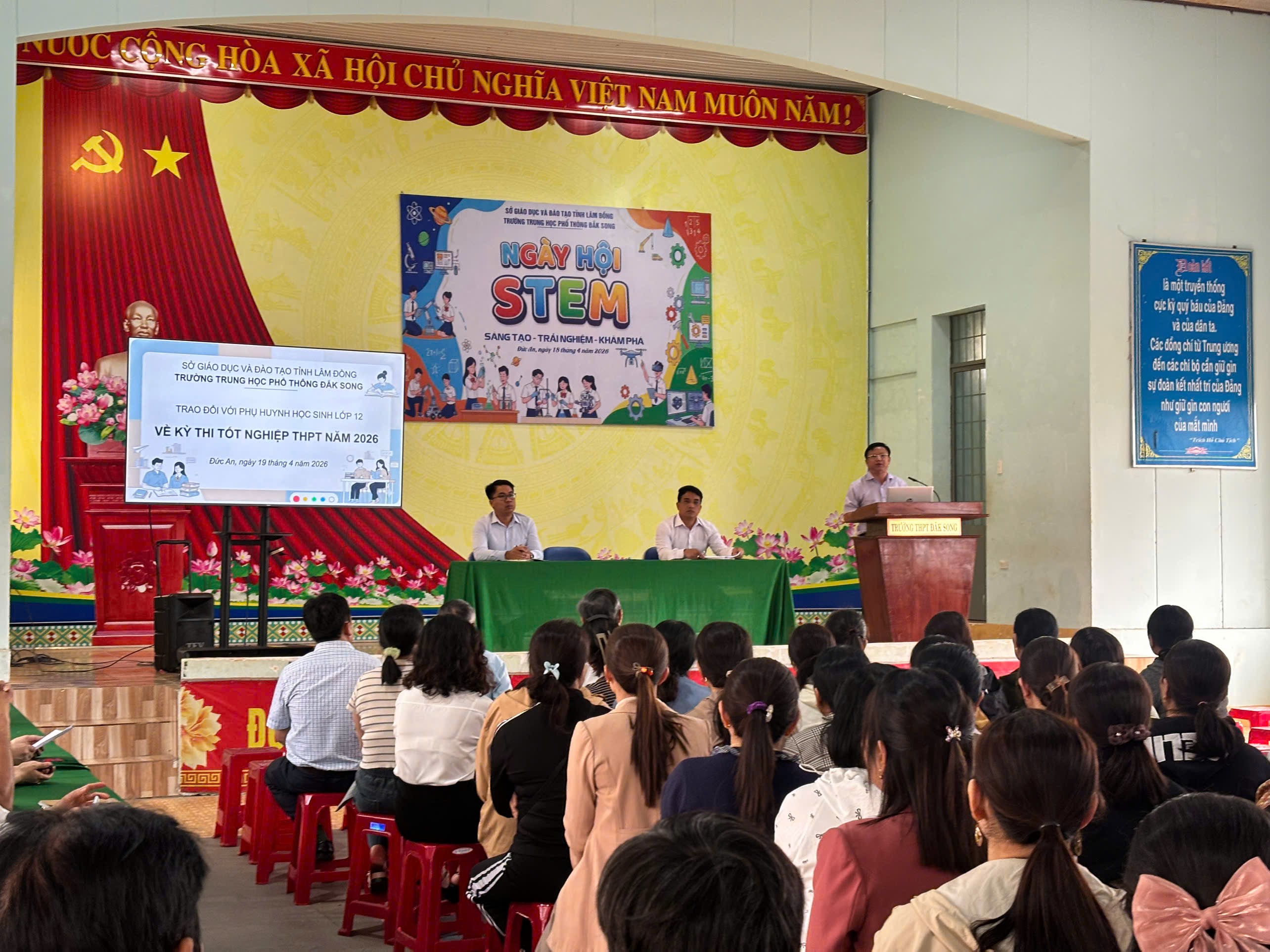 Sáng ngày 19/4/2026, Trường THPT Đắk Song đã tổ chức buổi họp toàn thể phụ huynh học sinh khối 12 trong không khí nghiêm túc, trách nhiệm, với sự tham dự của Ban Giám hiệu, giáo viên chủ nhiệm và đông đảo phụ huynh.