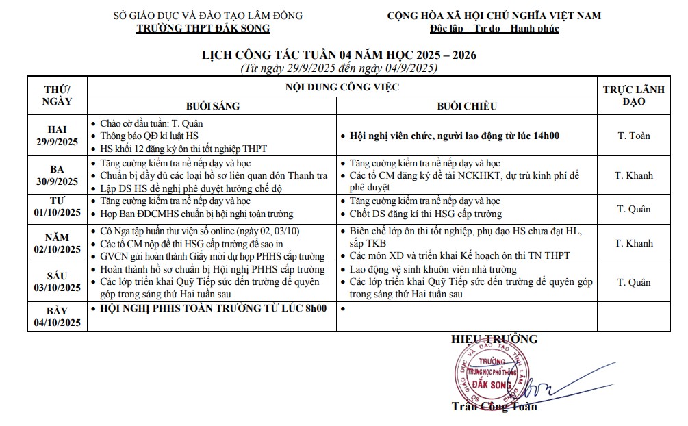 THỜI KHÓA BIỂU TUẦN 4/ 2025
